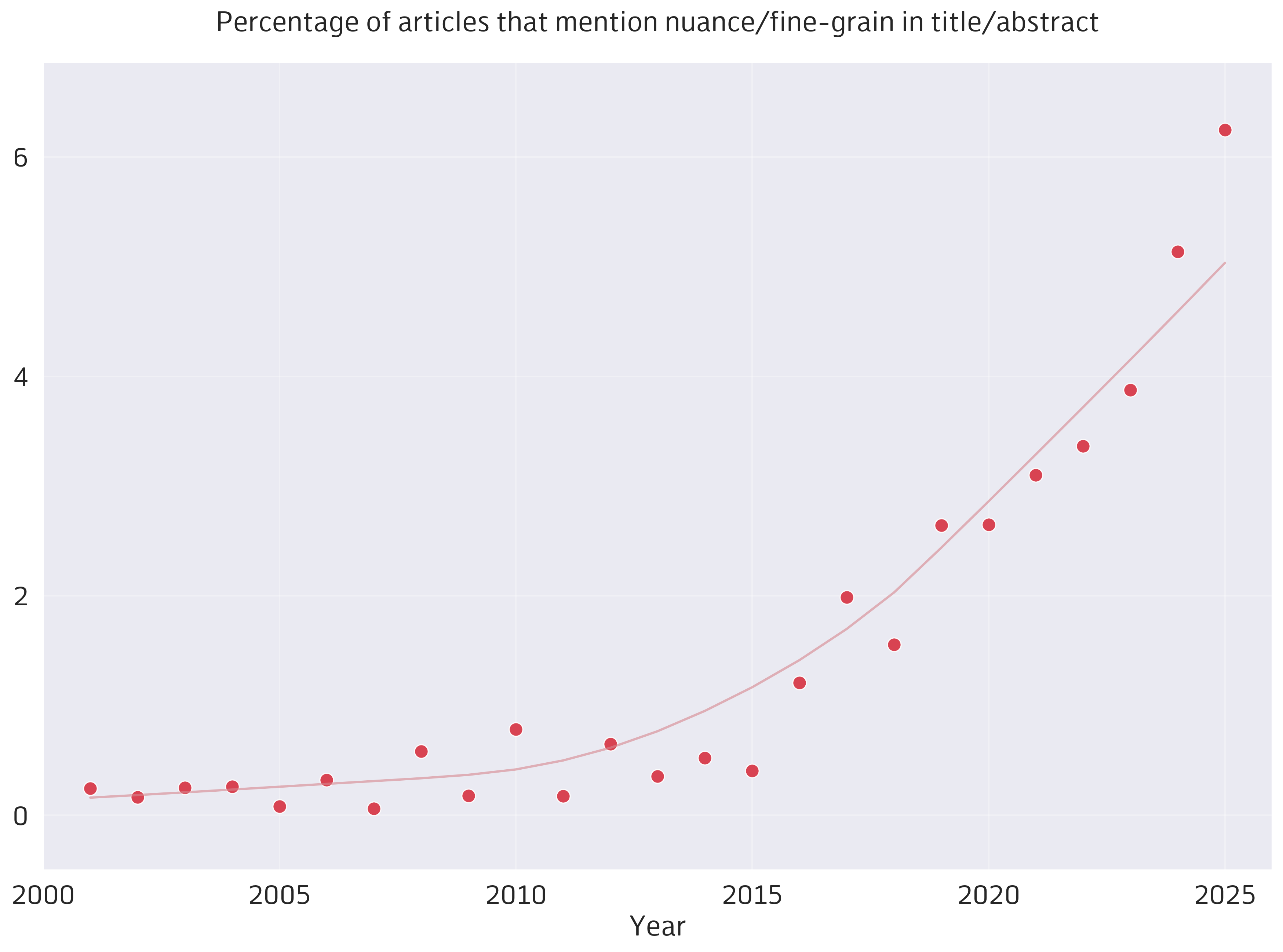 Nope. At the current rate of doubling, over half the papers published in *CL venues will mention nuance/fine-grain by 2040! I can’t wait to write the follow-up to this post in 2030 to see if we’ve reached peak nuance.